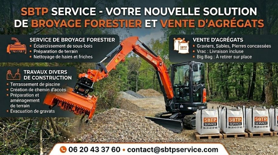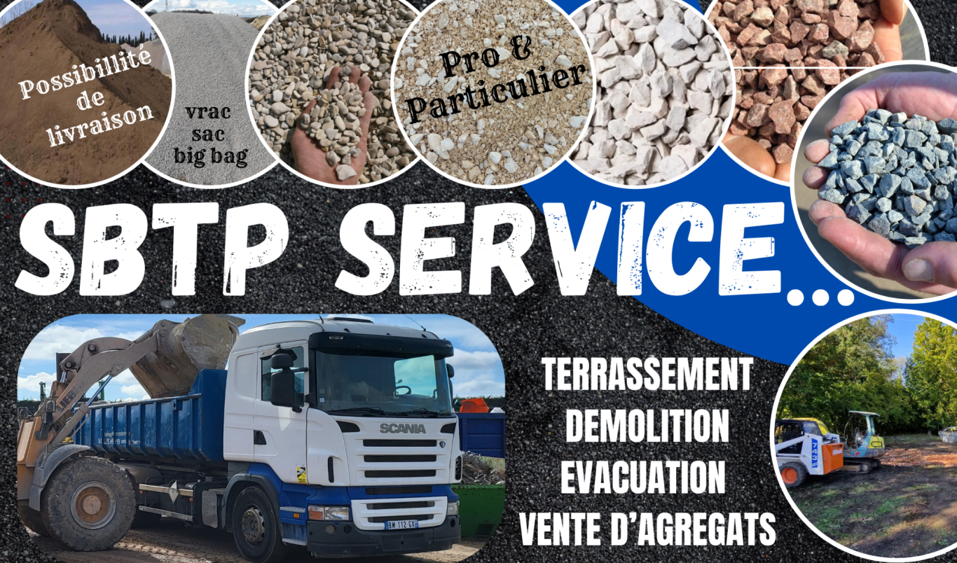 Chez SBTP Service, nous savons que des projets bien réalisés commencent par des fondations solides. Spécialistes en terrassement, démolition et évacuation, nous prenons en charge vos gravats et déchets verts avec efficacité et soin. Grâce à notre expertise en broyage forestier, nous vous aidons aussi à gérer vos espaces extérieurs tout en respectant l’environnement. Nous proposons également à la vente des agrégats en big bag de 0.25m², disponibles en retrait sur site ou en livraison en vrac directement sur vos chantiers. Notre engagement, c’est votre satisfaction et la qualité de notre travail. Contactez-nous dès aujourd'hui pour discuter de votre projet!